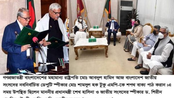 গণপ্রজাতন্ত্রী বাংলাদেশের মহামান্য রাষ্ট্রপতি মোঃ আবদুল হামিদ আজ বাংলাদেশ জাতীয় সংসদের ডেপুটি স্পীকার হিসেবে মোঃ শামসুল হক টুকু এমপি-কে শপথ বাক্য পাঠ করান। একাদশ জাতীয় সংসদের ৬৮ পাবনা-১ আসনের মাননীয়