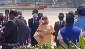 বিমানবন্দরে বাংলাদেশের প্রধানমন্ত্রীকে ভারতের রেল ও বস্ত্র প্রতিমন্ত্রী দর্শনা বিক্রম এবং ভারতে বাংলাদেশের হাইকমিশনার মুহাম্মদ ইমরান অভ্যর্থনা জানান।