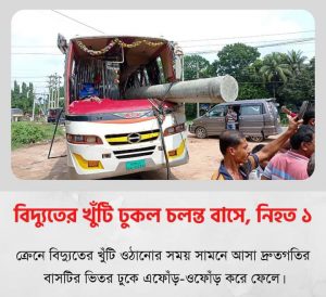 ফরিদপুরে ঢাকা-খুলনা মহাসড়কে একটি চলন্ত বাসে বিদ্যুতের খুঁটি ঢুকে এক বাসযাত্রী নিহত হয়েছেন। ওই সময় আরেকটি বাস ওই বাসে ধাক্কা দিয়ে রাস্তা পাশে পড়ে যায়।